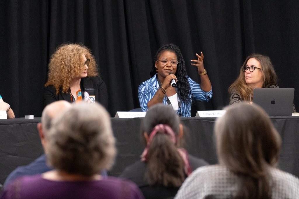 • Panel discussion: Three to four presenters from different backgrounds discuss a topic together and engage with the audience.